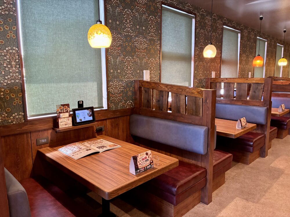 木の温もりあふれる内装に、英国調の壁紙や落ち着いた照明が魅力の店内。8時からのモーニングはハンバーグやトーストメニューが豊富で、コーヒーのお替り無料。ボックスやテーブル席を備え、一人でも、家族や友人ともゆったり過ごせる。