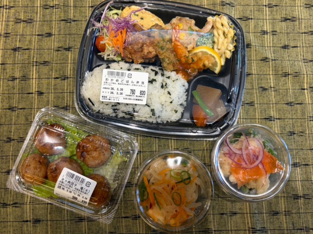 オイシイオトの定番弁当に加え、唐揚げや白身フライなどの揚げ物、魚の煮つけ、肉団子、サラダなどの惣菜を単品でも販売。椿店限定の弁当もそろう。店内調理ならではの出来立てのおいしさが魅力。20時まで営業で、夕食の一品にも便利。
