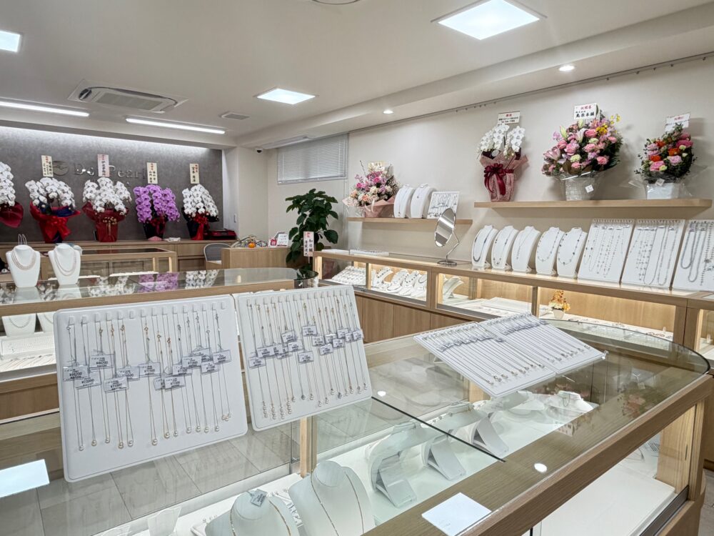 宇和島の海で育まれた真珠を扱う土居真珠が、ロープウェー街のビル1階に出店。店頭でサイズや色を選んで仕立てるネックレスのほか、日常使いしやすいアクセサリーや贈り物向けの商品、ゴールド・シルバーのペンダントやピアスが並ぶ。